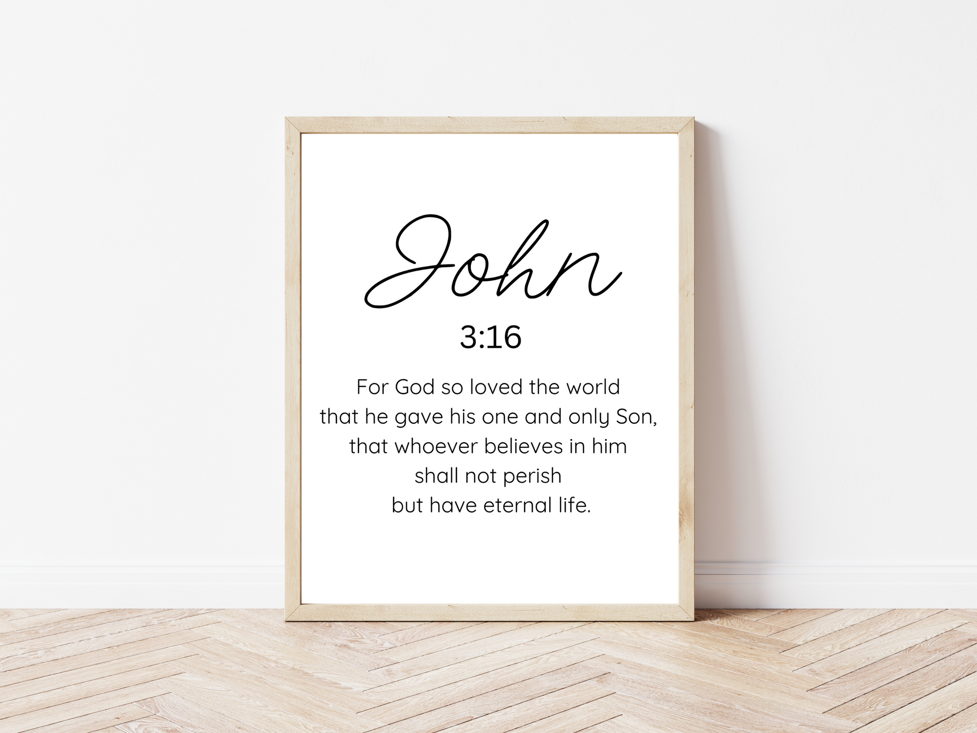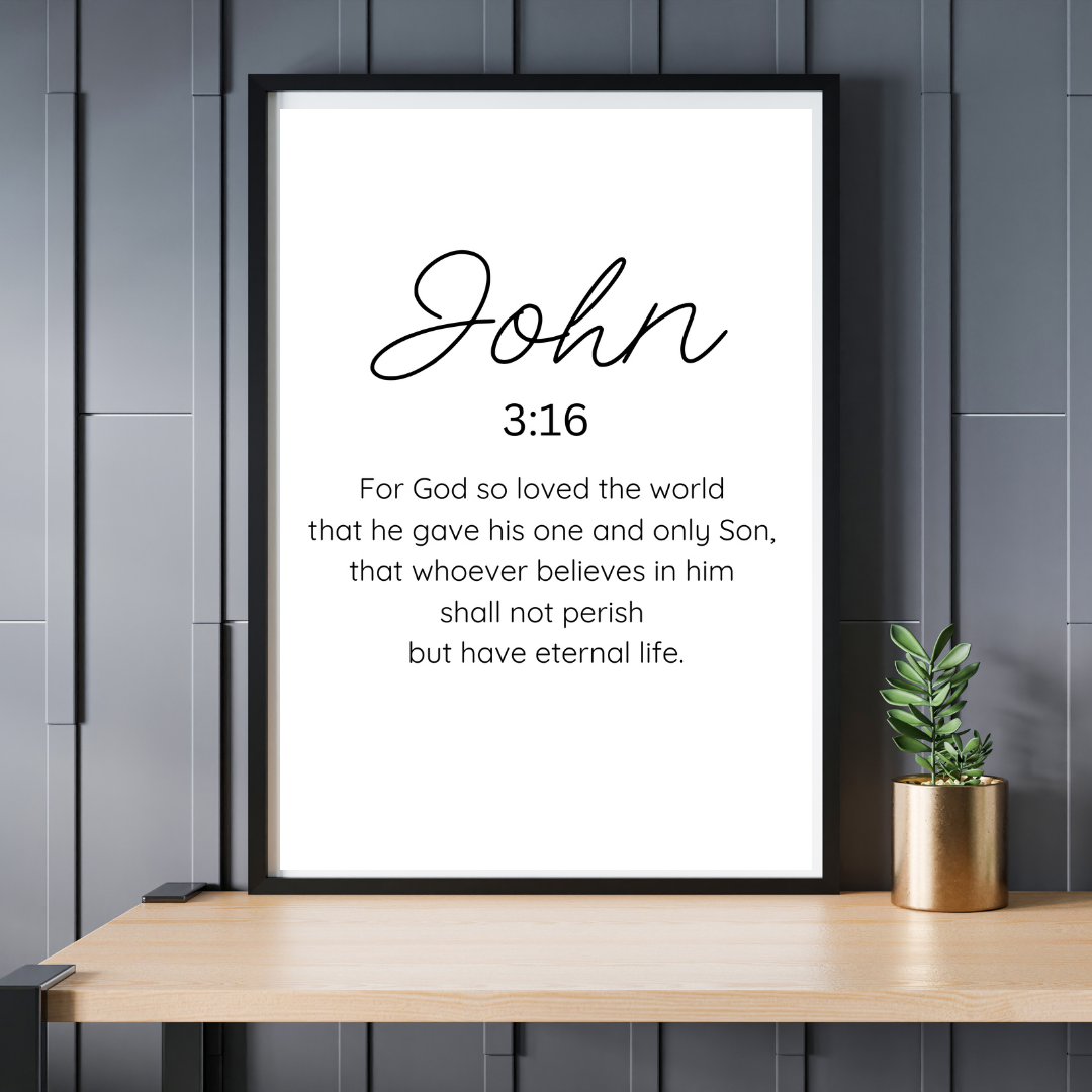 Bring the powerful message of John 3:16 into your home with this inspiring printable wall art. Perfect for personal reflection, church decor, or as a meaningful gift for loved ones. Order now and enrich your space with the promise of eternal life and God's unwavering love.