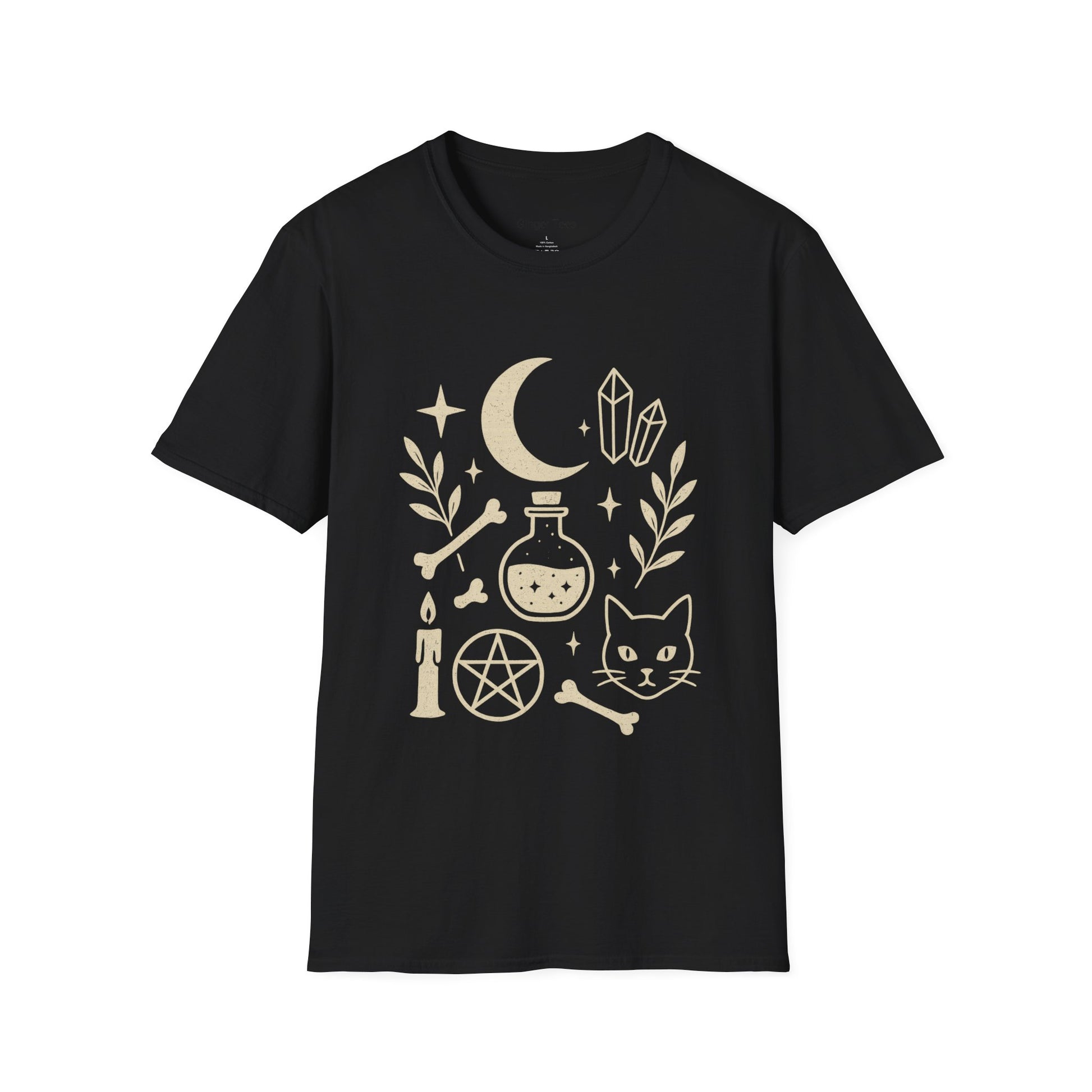 A black T-Shirt featuring witch symbols, perfect for those who love occult themes and unique designs. This softstyle unisex T-Shirt is made from 100% ring-spun cotton, ensuring durability and comfort. It's ideal for adults looking to express their witchy aesthetic during Halloween, witchcraft celebrations, or everyday wear.